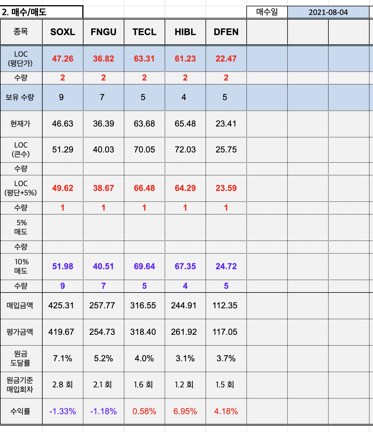 SOXL 빼고는 LOC 큰수 위주로 매수가 되고 있다.