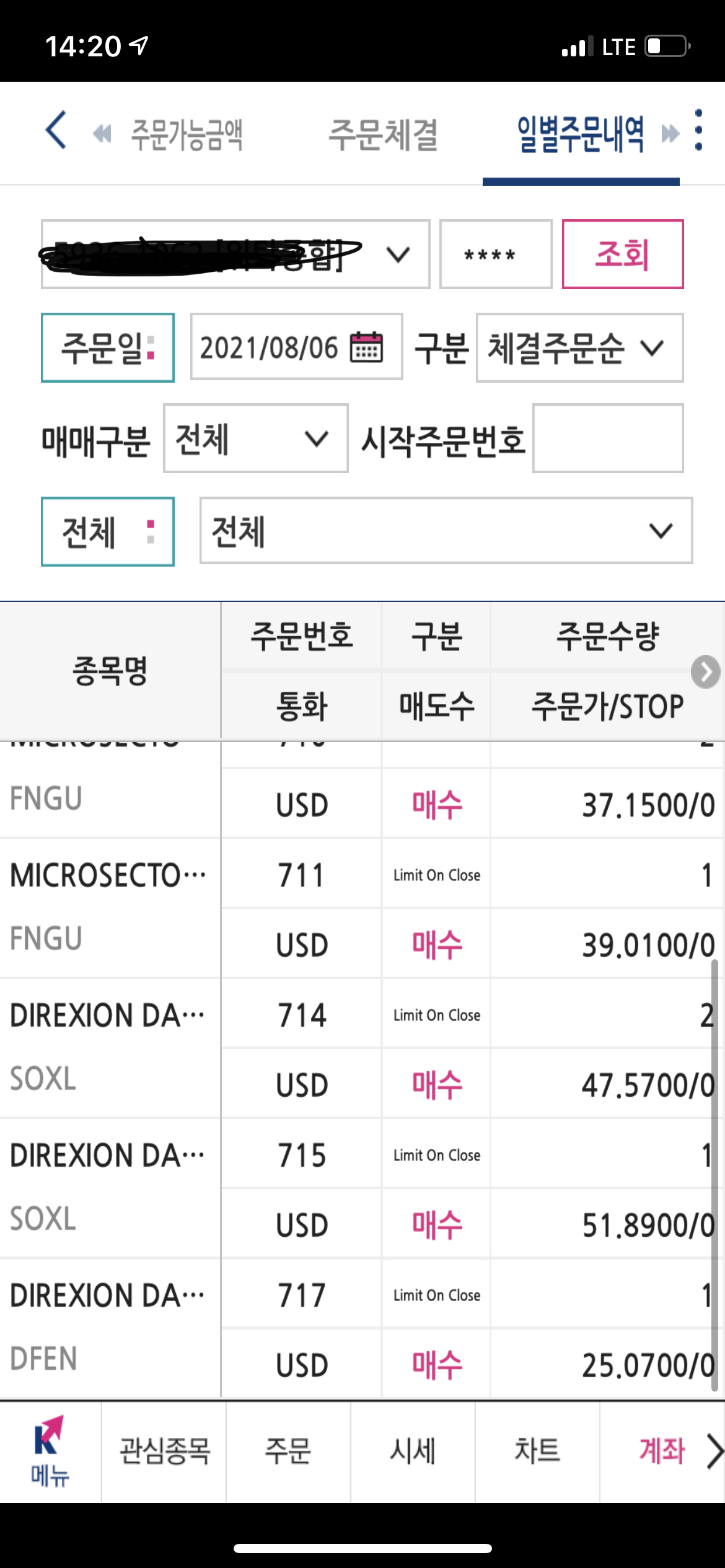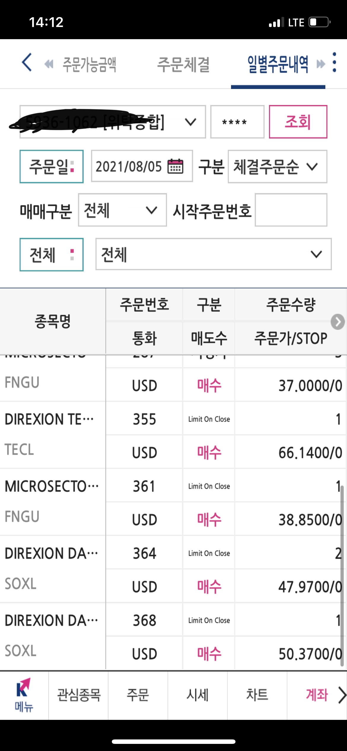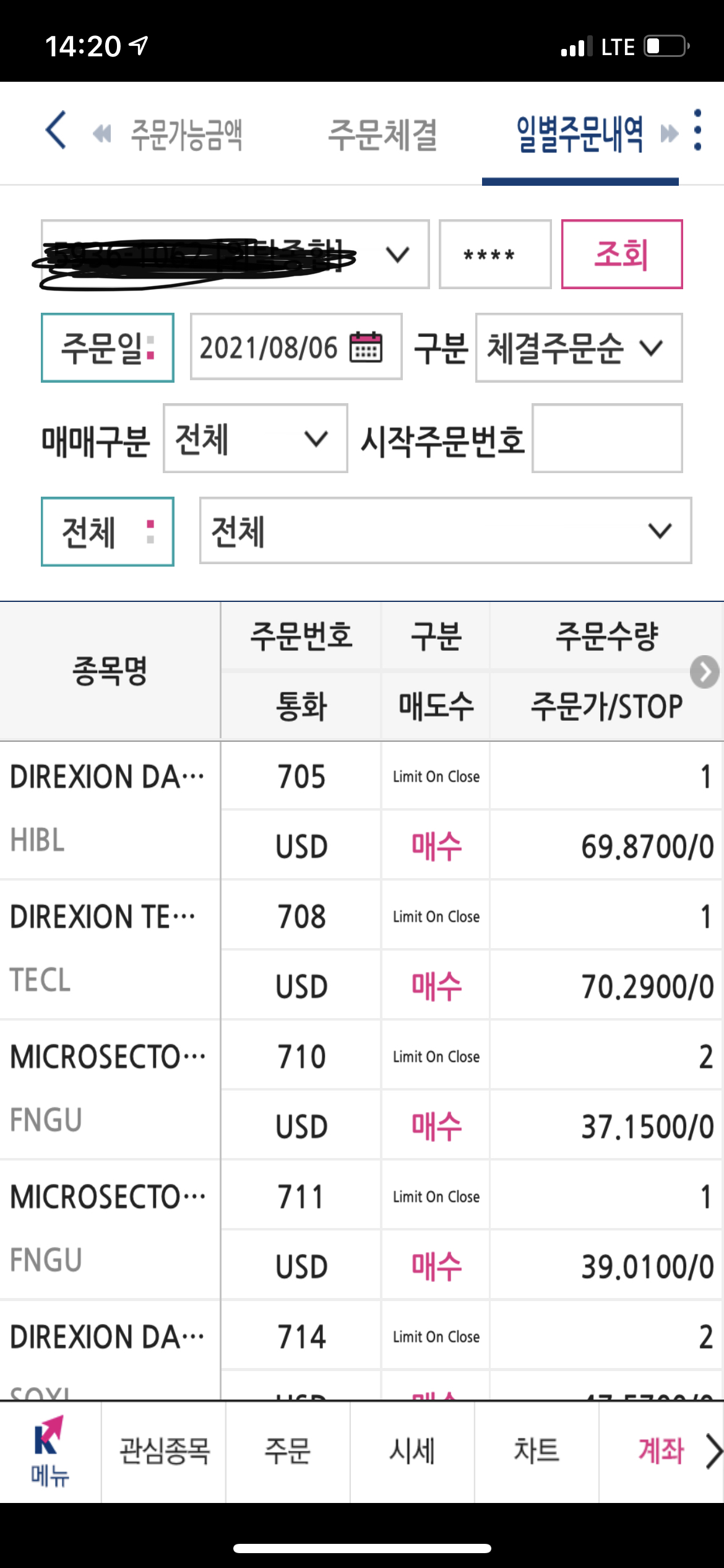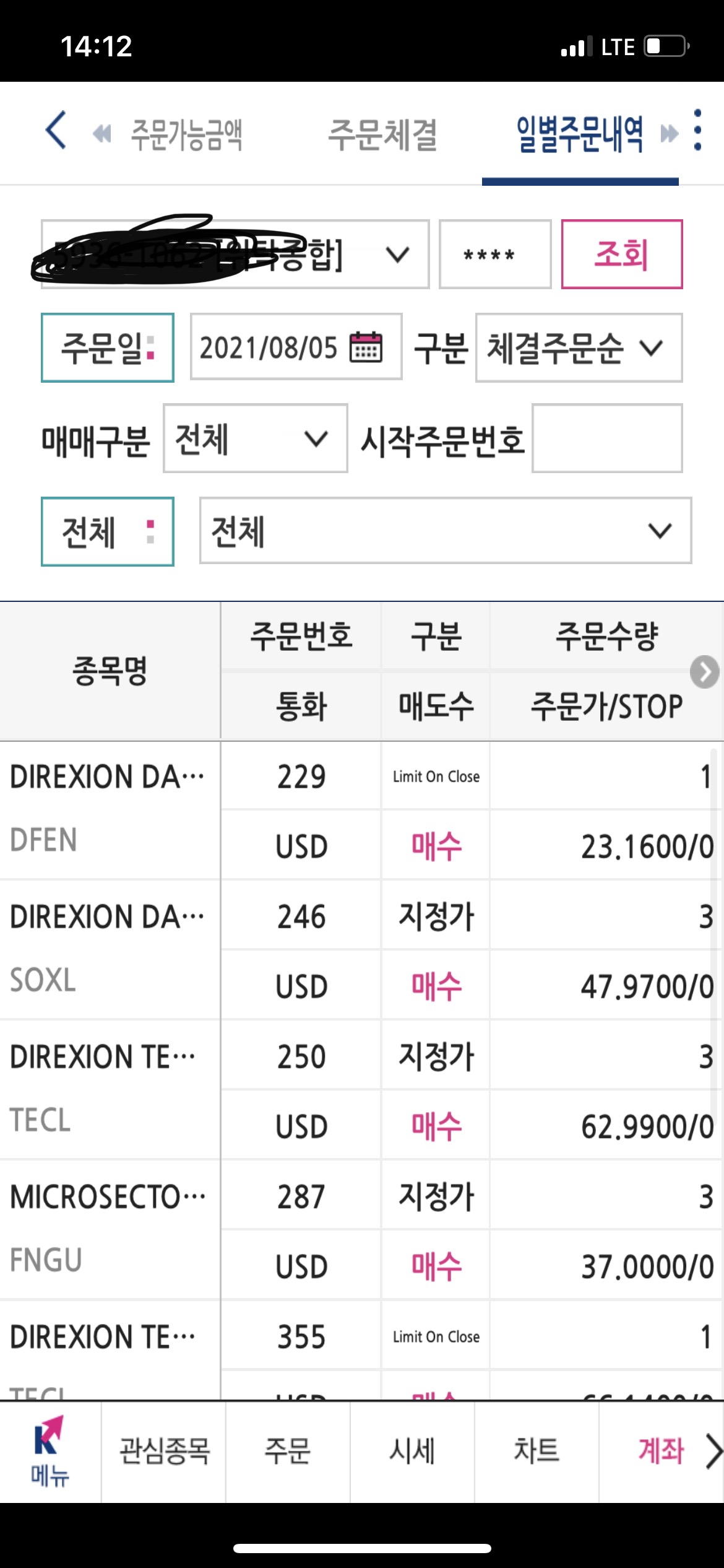 그래서 다음날 5일에는 프리장에 나머지 3종목을 매수하고 동시에 LOC 작은수, 큰수를 주문했다.