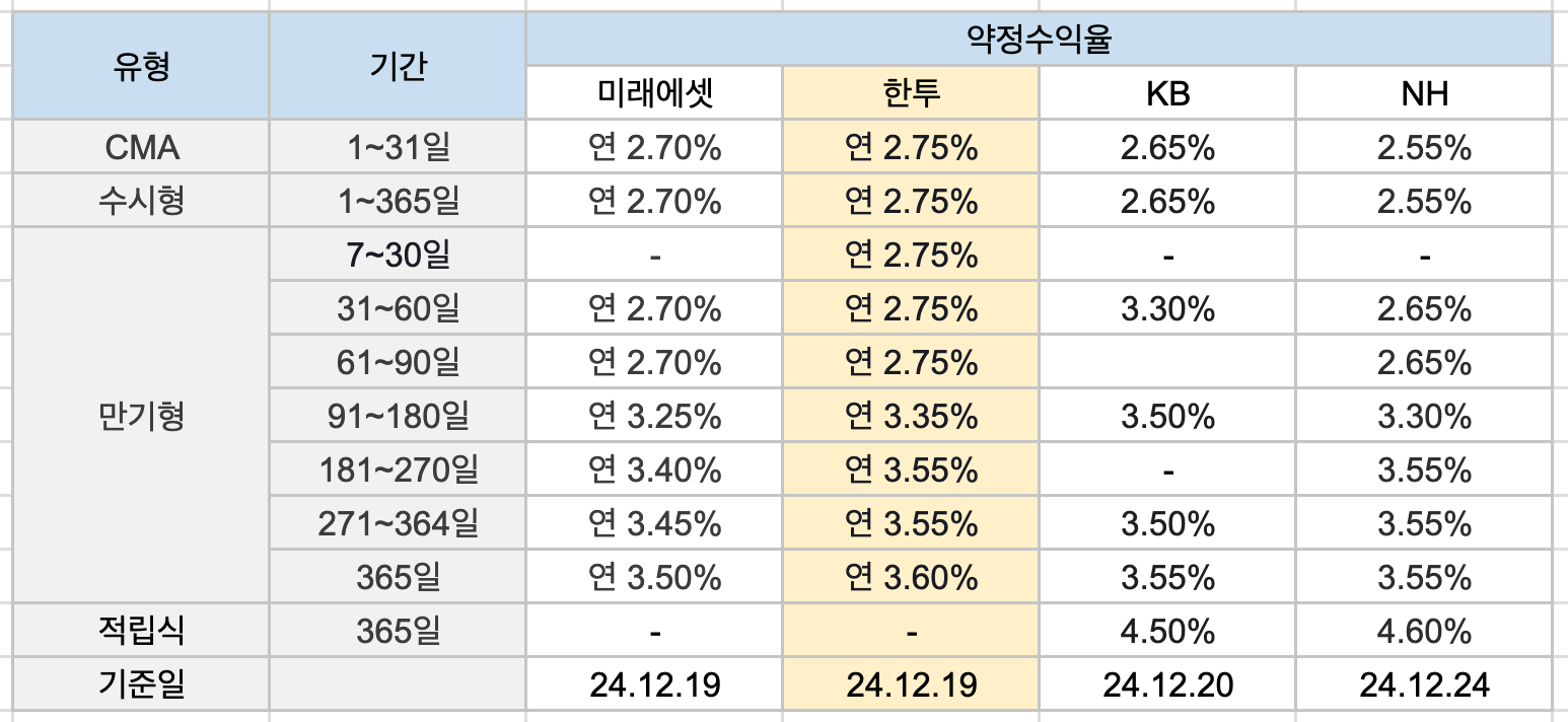 한때 3.5, 3.4 까지 던 CMA 수익율이 모두 2% 대로 떨어졌다.