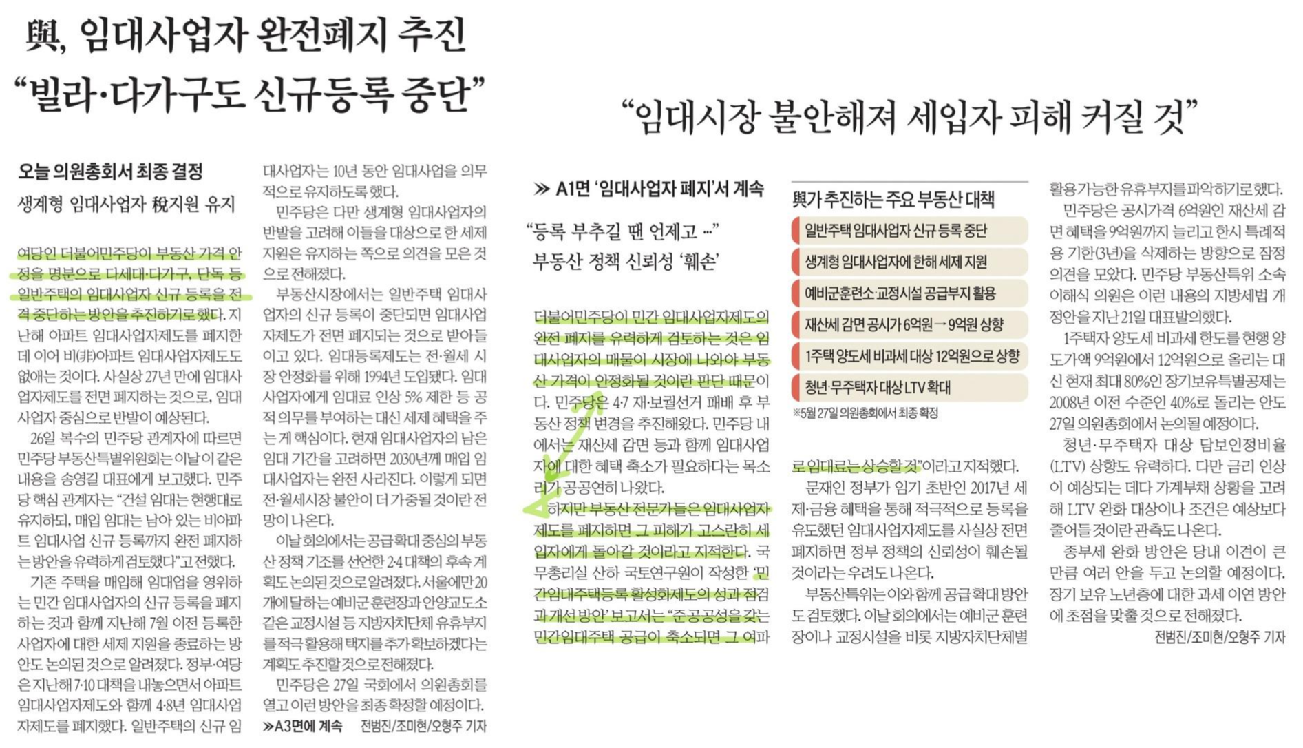 여당인 더불어민주당이 일반주택의 임대사업자 신규 등록을 중단하는 방안을 추진한다고 합니다.